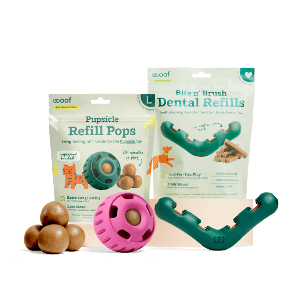 Your starter set for smarter, more active play—three 2-in-1 toys and matching Woof Puzzle Treats.