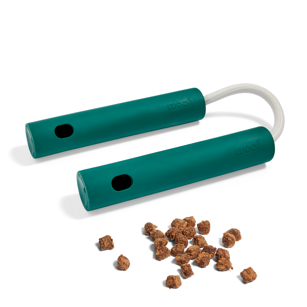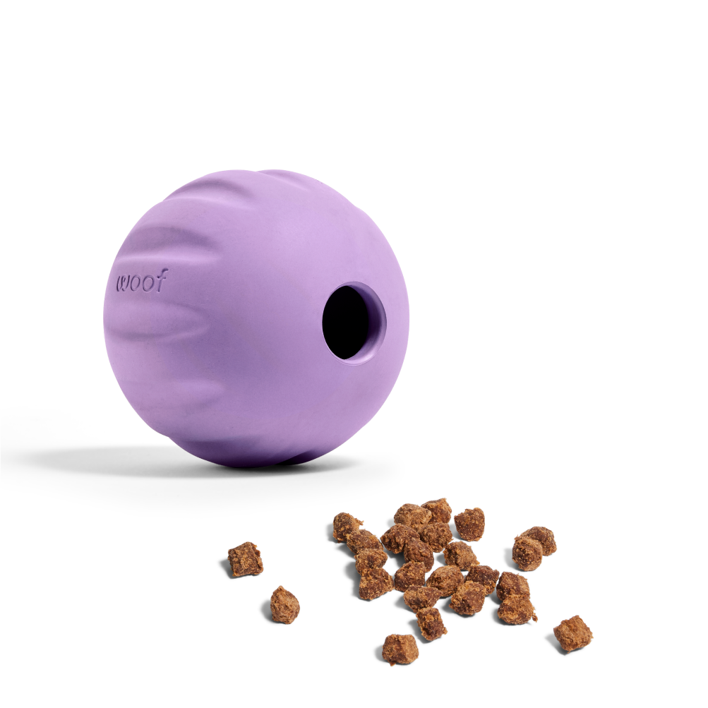 To insert treats into the flyball, insert the training treats into the hole in the ball, and then give it a little shake, so that the treats make their way through the different chambers inside the ball. This will create a long-lasting enrichment activity for your pup!