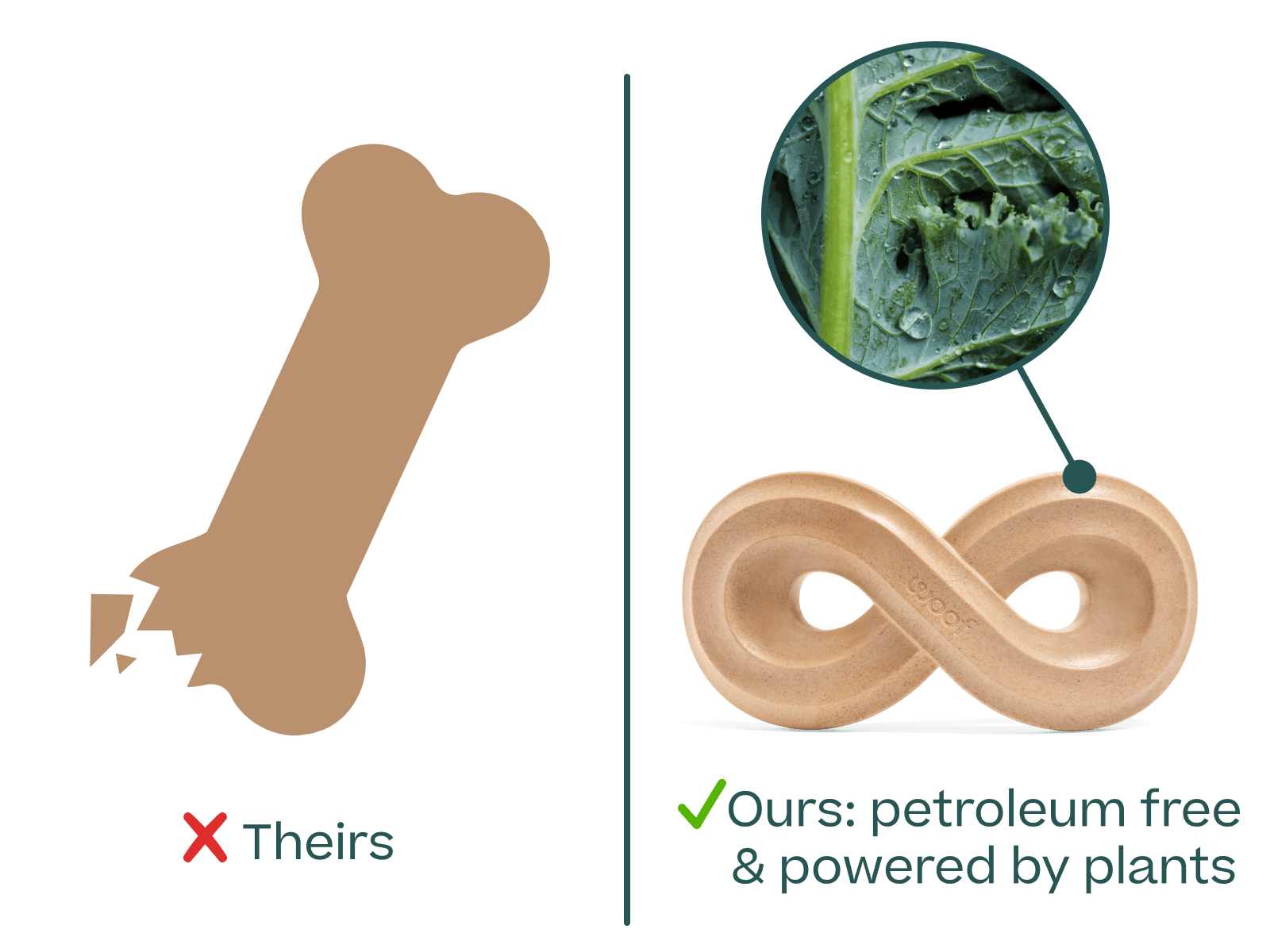 Most similar products on the market are made from straight plastic/nylon, or other petroleum-based materials. The HonestChew is primarily plant-based, making it a more natural alternative for power chewers. Perfect for your pup to get chewing!