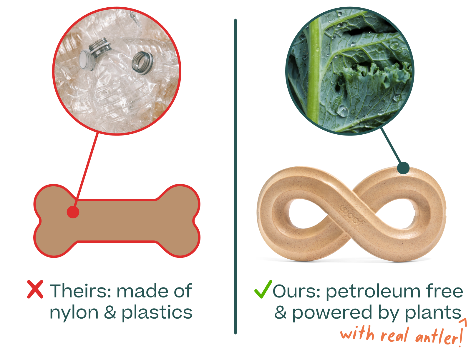Only the best for you and your pup! The HonestChew is nylon-free, splinter-resistant, and made to flake instead of splinter during use to prioritize your pup’s safety. It is made from food-grade, plant-based ingredients, with real antler powder added in. No nylon here!
