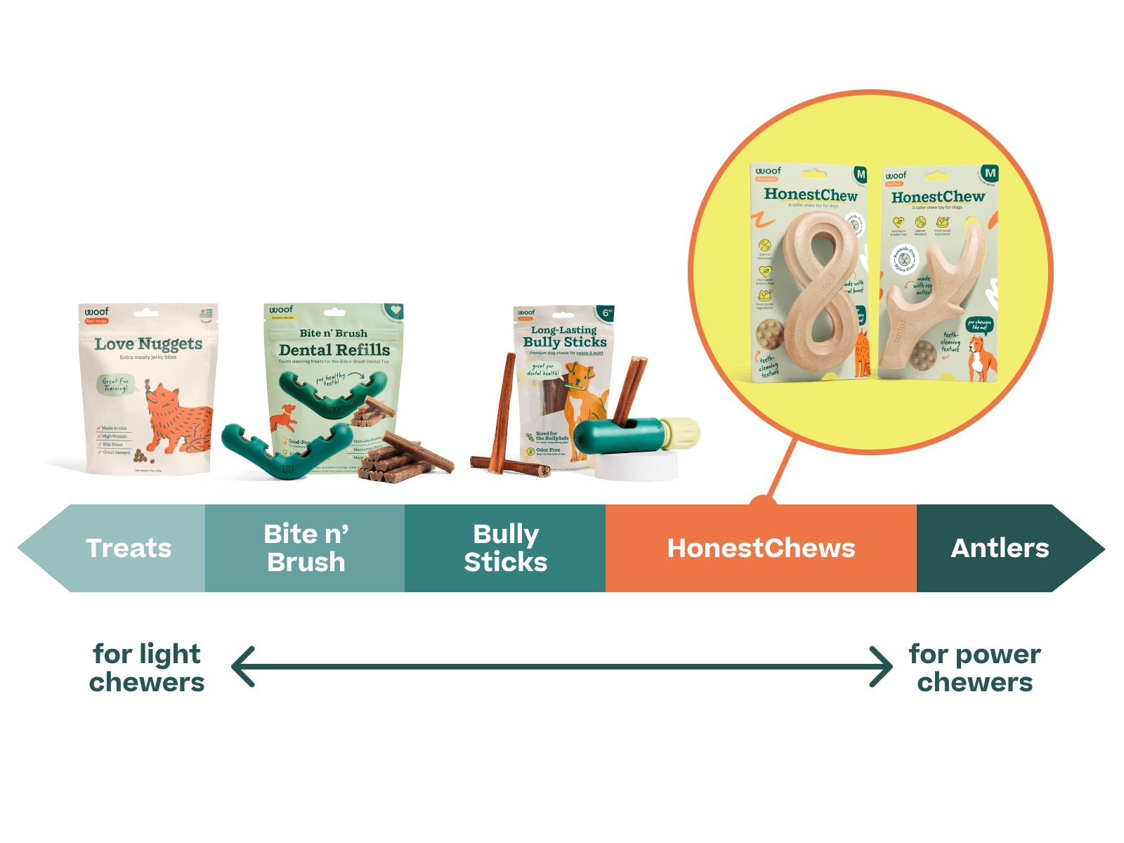 Even the best chews need a re-up once in a while! We recommend replacing once your pup has chewed through more than 30-40% of their HonestChew. A good way to judge this is when all the points have been chewed off the Antler, or when the teeth-cleaning texture on the back of the Infinity Bone is worn down. You can also subscribe to a regular HonestChew delivery at a cadence that works for you!